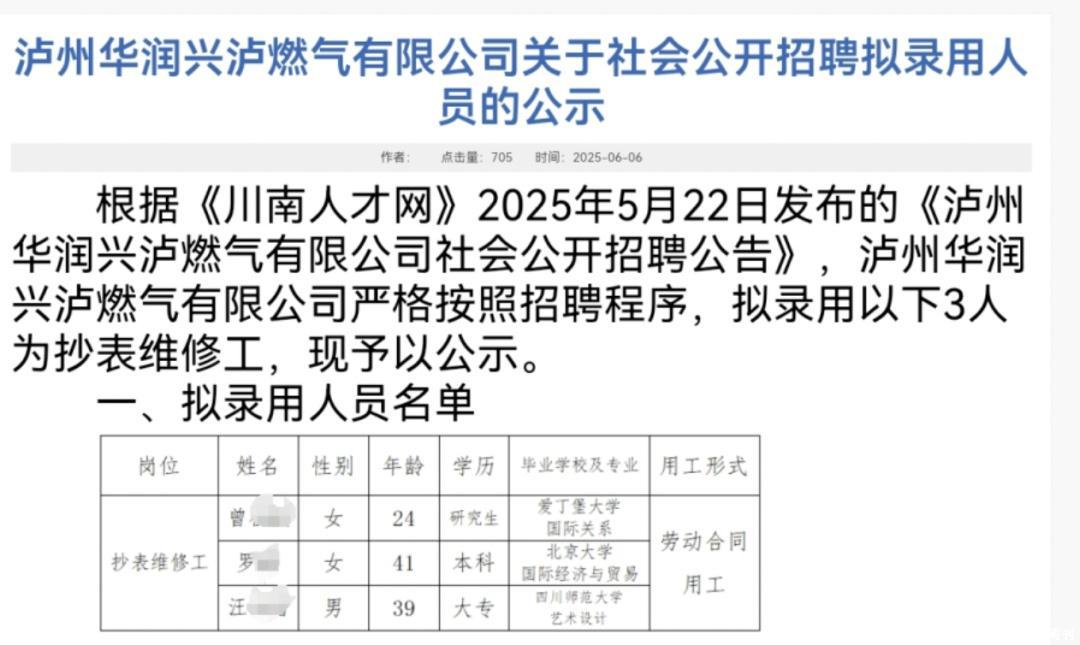 近日,泸州华润兴泸燃气有限公司招聘3名抄表维修工,拟录用名单中的3人分别是24岁的爱丁堡大学国际关系专业研究生、41岁的北京大学国际经济与贸易专业本科生、39岁的四川师范大学艺术设计专业大专生。该名单引发热议。